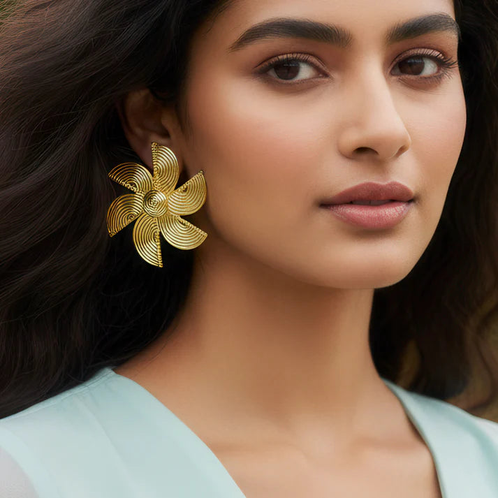 The exquisite fan-shaped design of these spectacular studs combines sophisticated sophistication with strong craftsmanship. They instantly stand out because to their wide, structural form, which also adds a distinctive touch to any ensemble. While the polished gloss guarantees a hint of classic appeal, their expertly made details add depth and texture. They are comfy and lightweight, which makes them ideal for all-day wear despite their striking design. These studs are perfect for people who like unusual jewelry because they can easily go with more formal wear or instantly dress up casual ensembles. They have a contemporary yet timeless appeal thanks to their adaptable design, which enables them to go from day to night with ease. An ideal piece to add flair and excitement without overpowering your overall look.