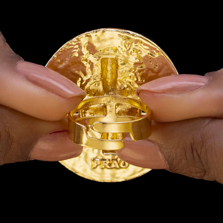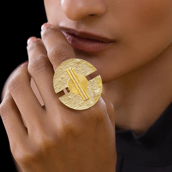 This ring's semi-circular statement shape adds a striking geometric flair while maintaining an understated elegance. The piece has a contemporary edge that appeals to those who enjoy one-of-a-kind jewelry because of the semi-circles' smooth curves, which harmoniously blend symmetry and current flair. Its simple yet eye-catching design makes it adaptable and goes well with both formal and casual settings. It adds a unique style without overpowering your attire and is comfy and lightweight. It gives a sophisticated artistic touch whether worn alone or stacked with other rings. This ring is ideal for people who enjoy accessories with geometric designs since it combines modern refinement with a stylish, original twist that is always noticed.